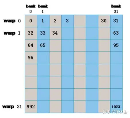 __shared__ float sData[32][32];sData[0][0]、 sData[1][0]、sData[2][0]、... 、sData[31][0] 位于 bank 0.